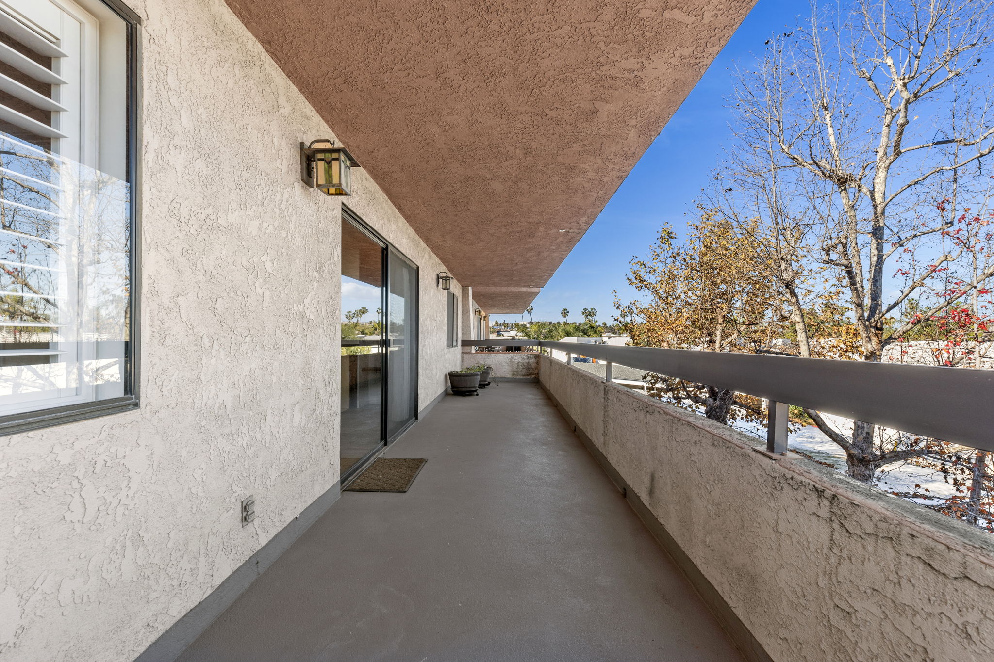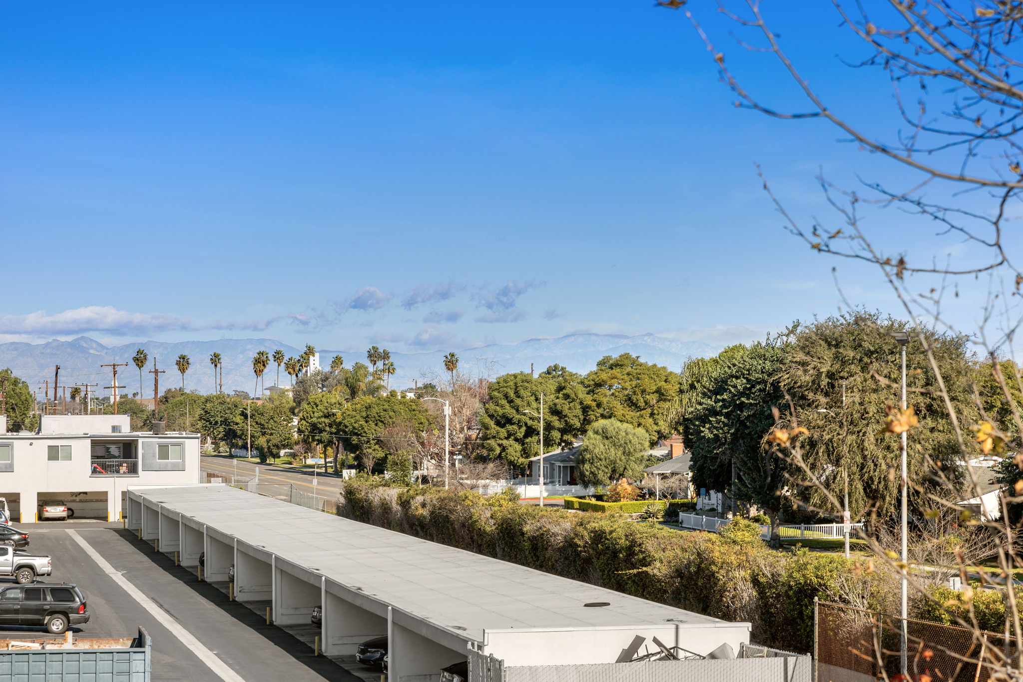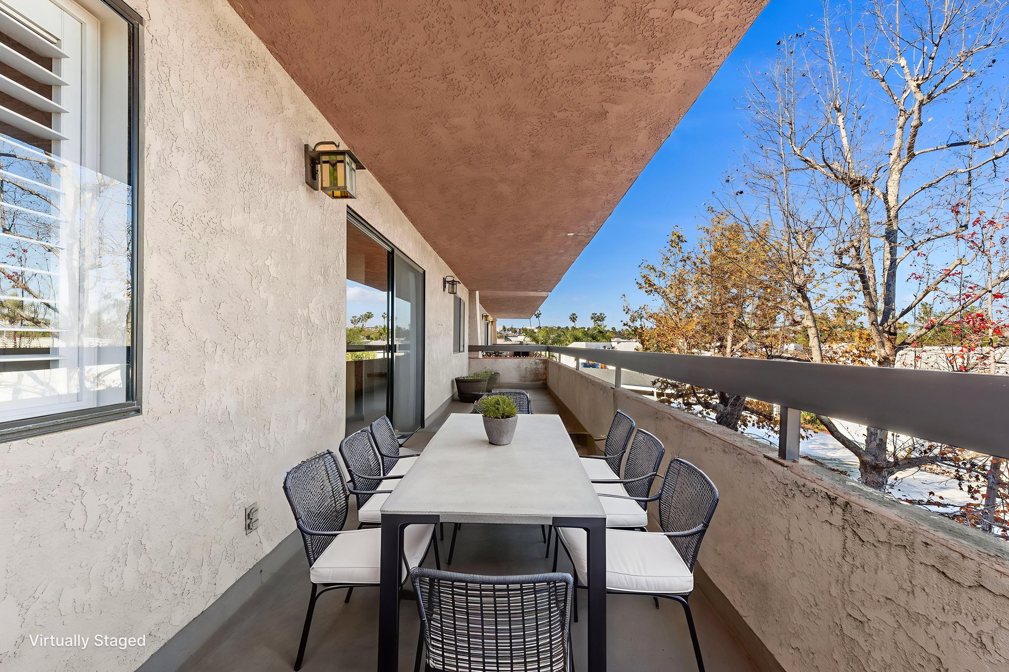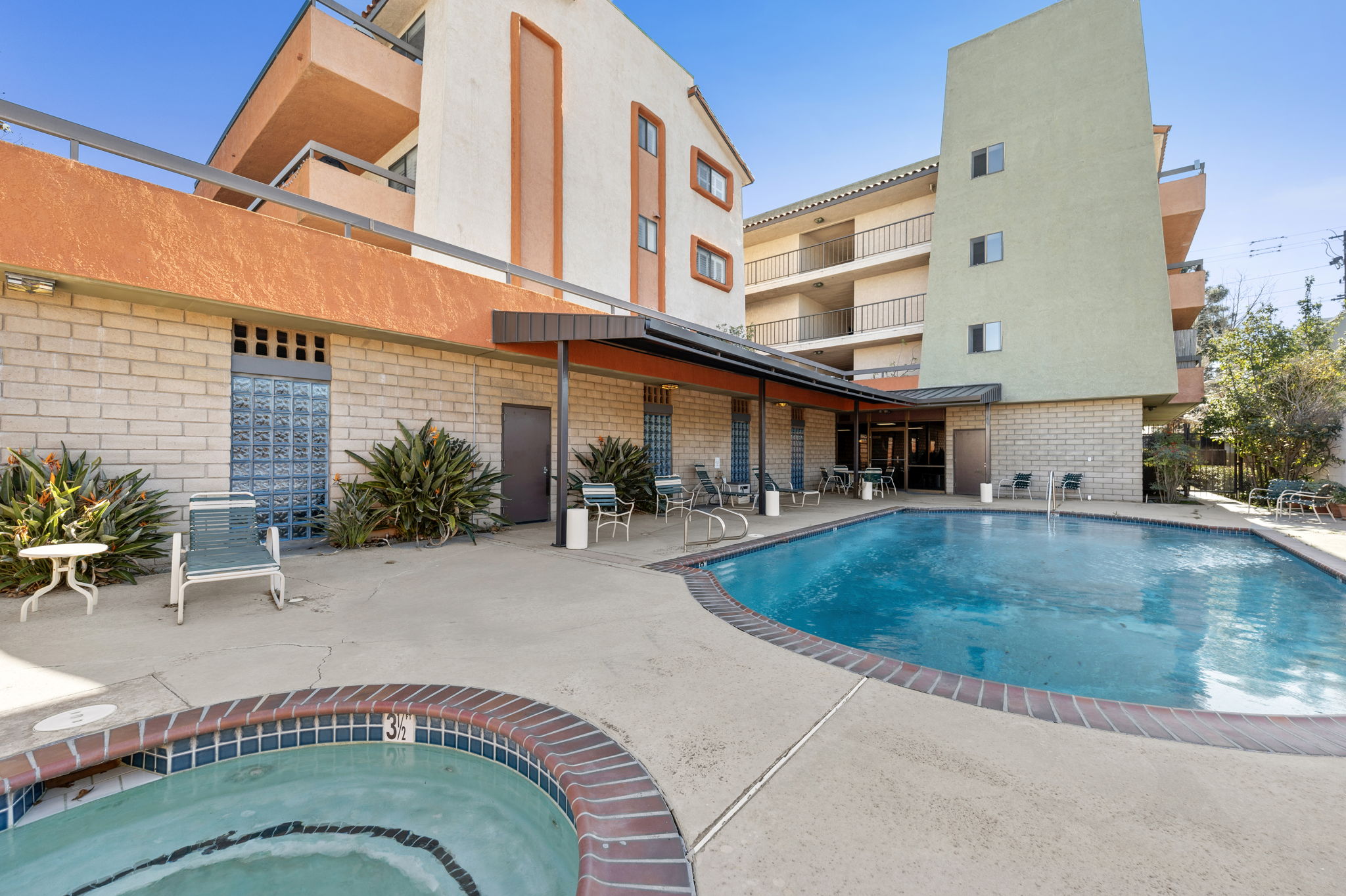 Engineered hardwood flooring creates a refined ambiance, while the kitchen features granite countertops, designer backsplash, and stainless steel appliances. The spacious primary suite offers an en-suite bath with dual sinks, while the second bedroom includes its own private en-suite bath with a generous shower and extended counter space. Enjoy indoor-outdoor living on the long private balcony with neighborhood views, plus the convenience of in-unit laundry. Community amenities include pool, spa, and controlled access. Two side-by-side garage parking spaces included.