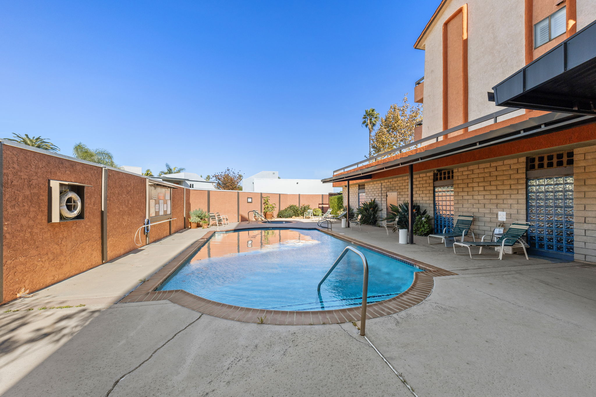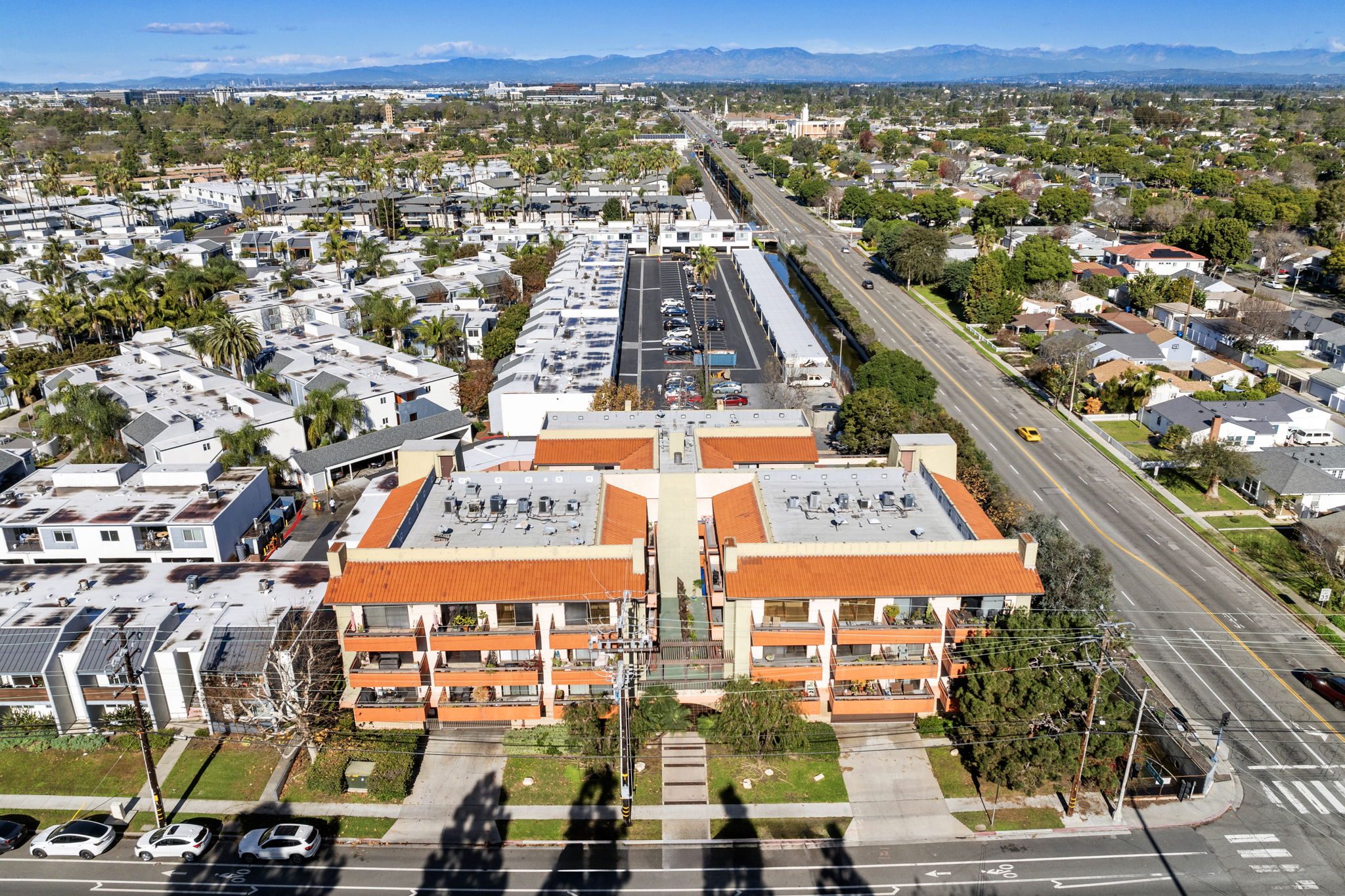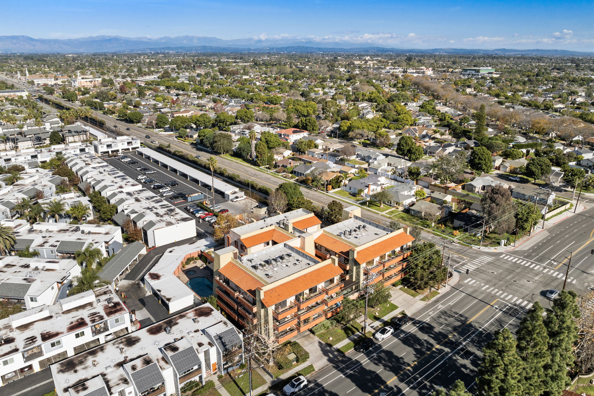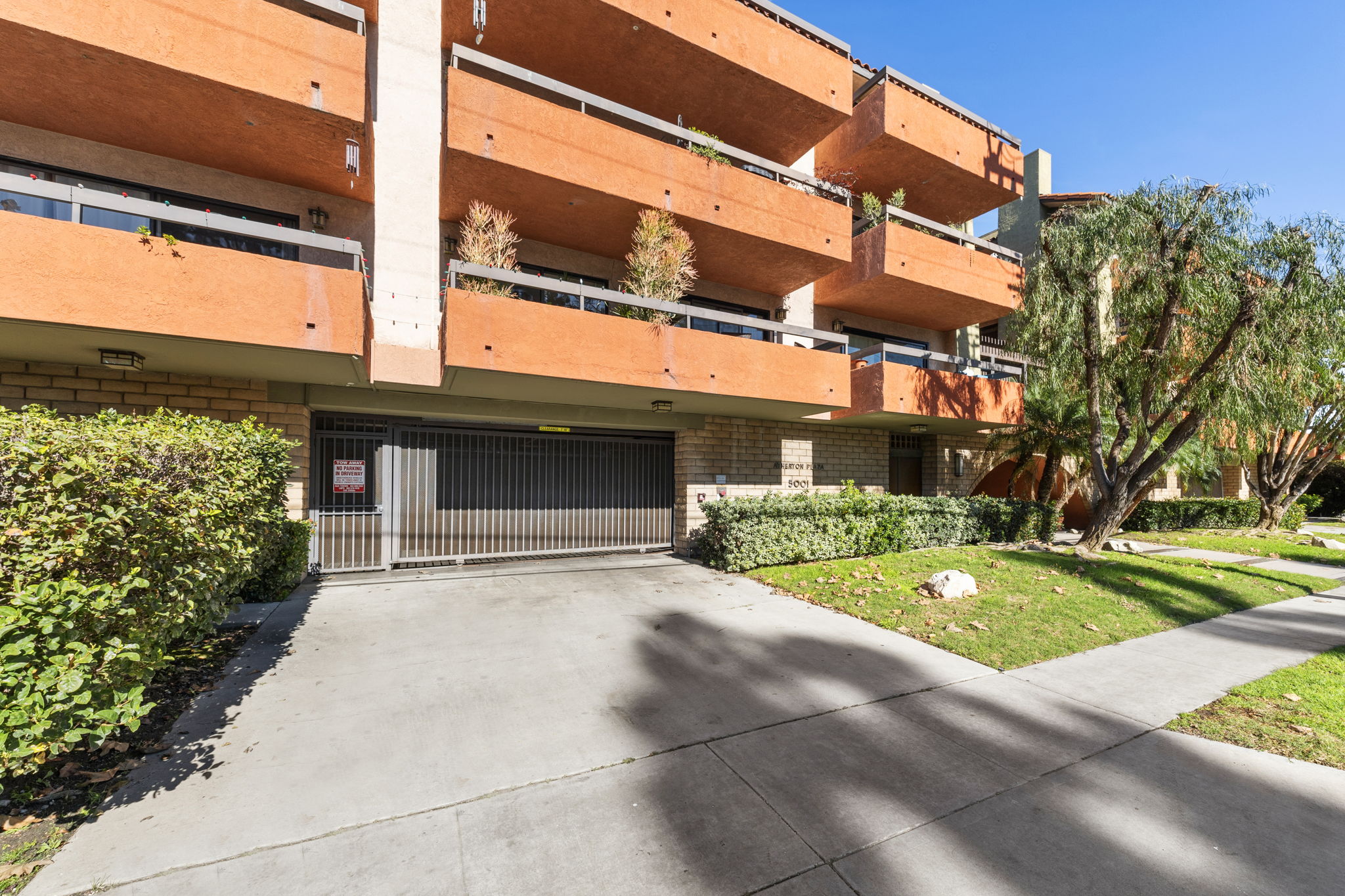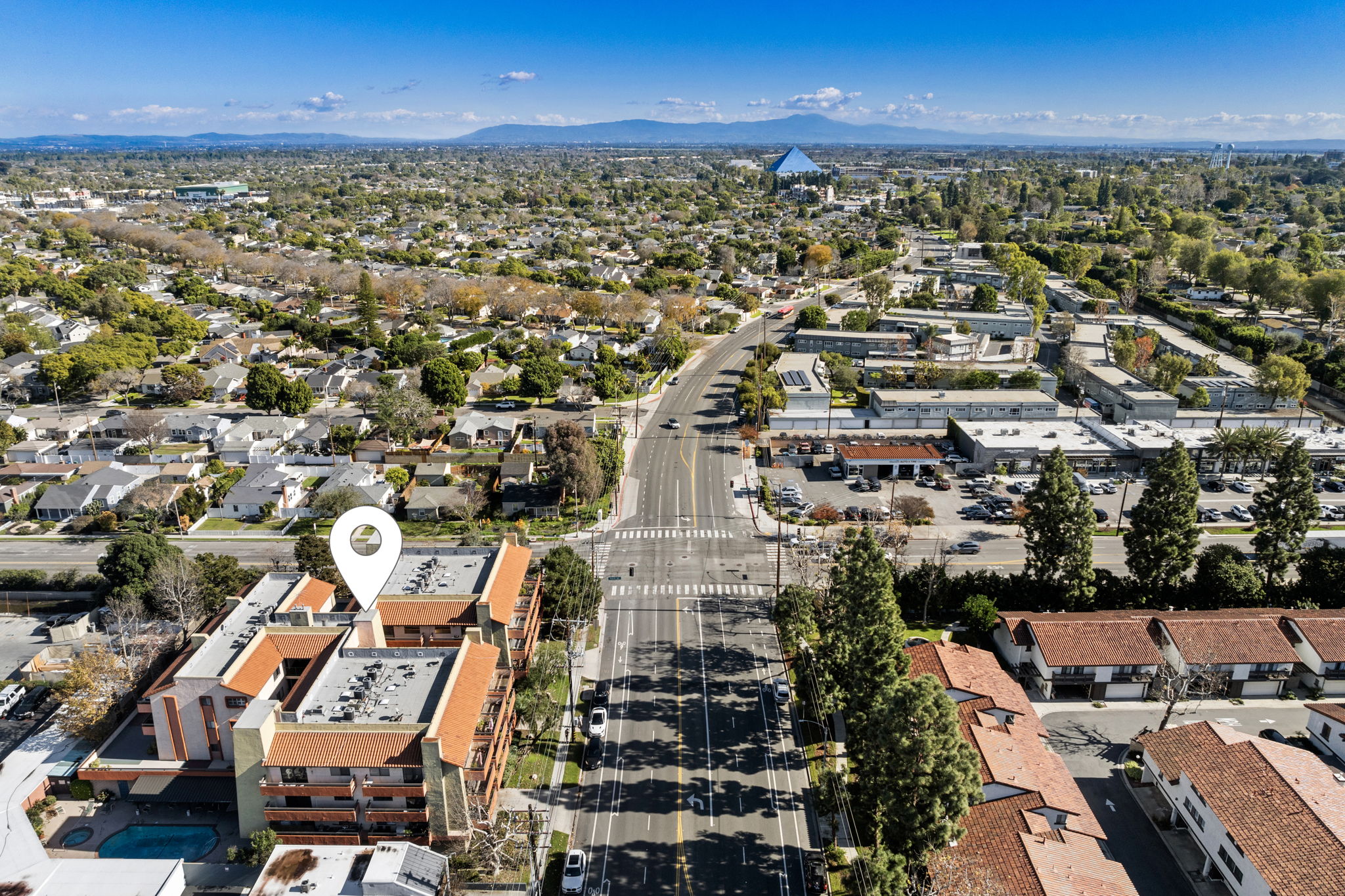 Engineered hardwood flooring creates a refined ambiance, while the kitchen features granite countertops, designer backsplash, and stainless steel appliances. The spacious primary suite offers an en-suite bath with dual sinks, while the second bedroom includes its own private en-suite bath with a generous shower and extended counter space. Enjoy indoor-outdoor living on the long private balcony with neighborhood views, plus the convenience of in-unit laundry. Community amenities include pool, spa, and controlled access. Two side-by-side garage parking spaces included.