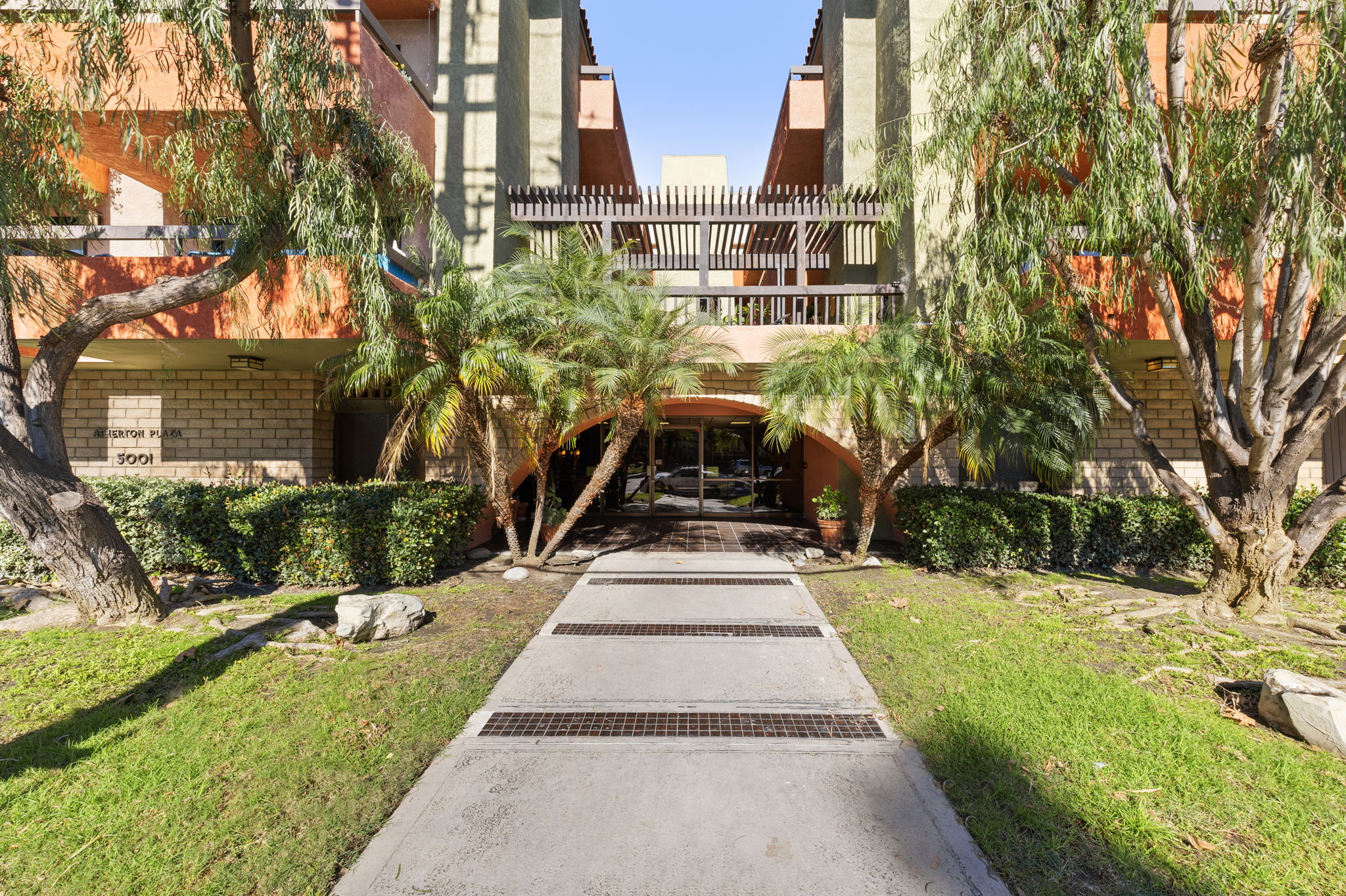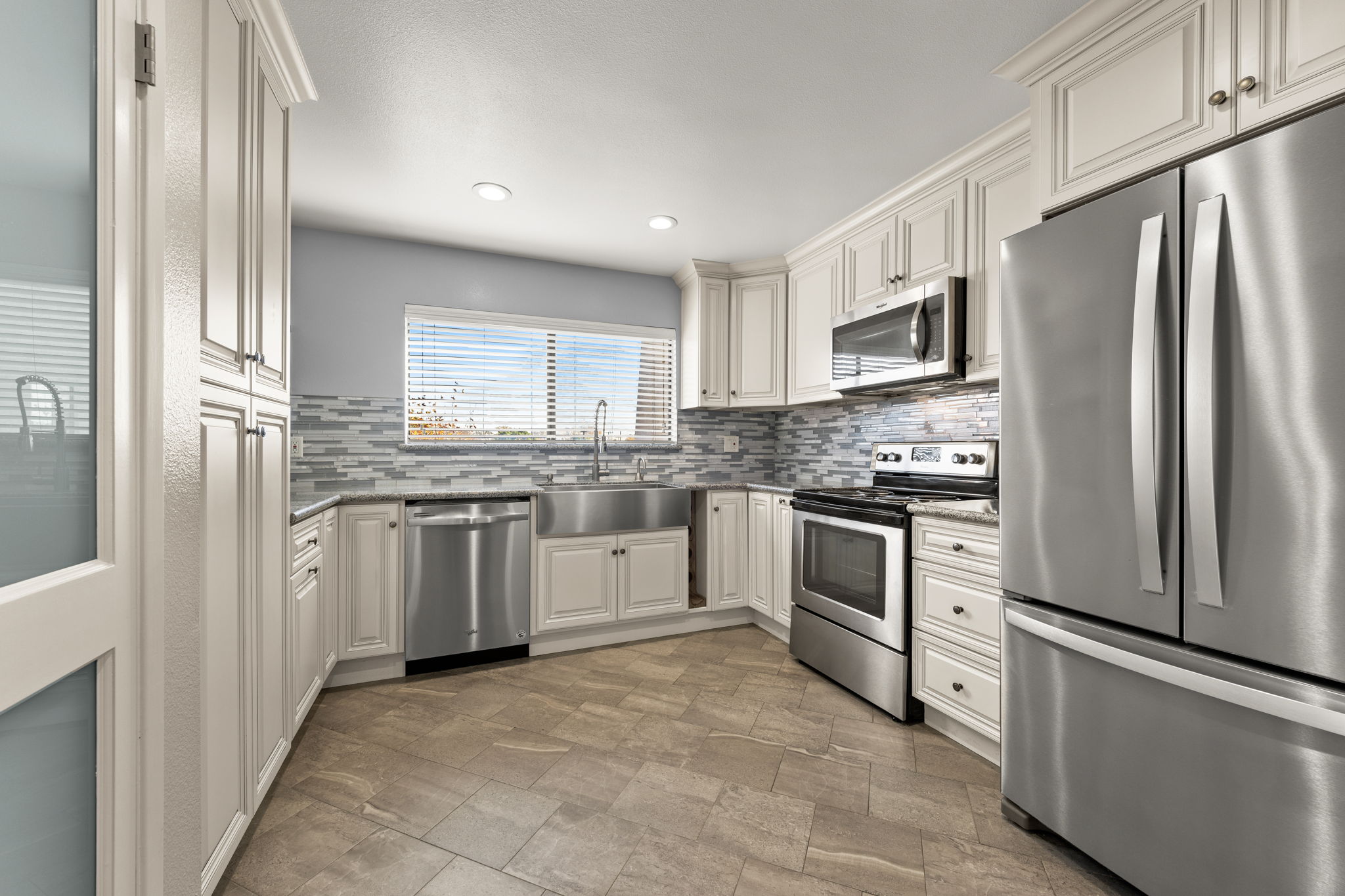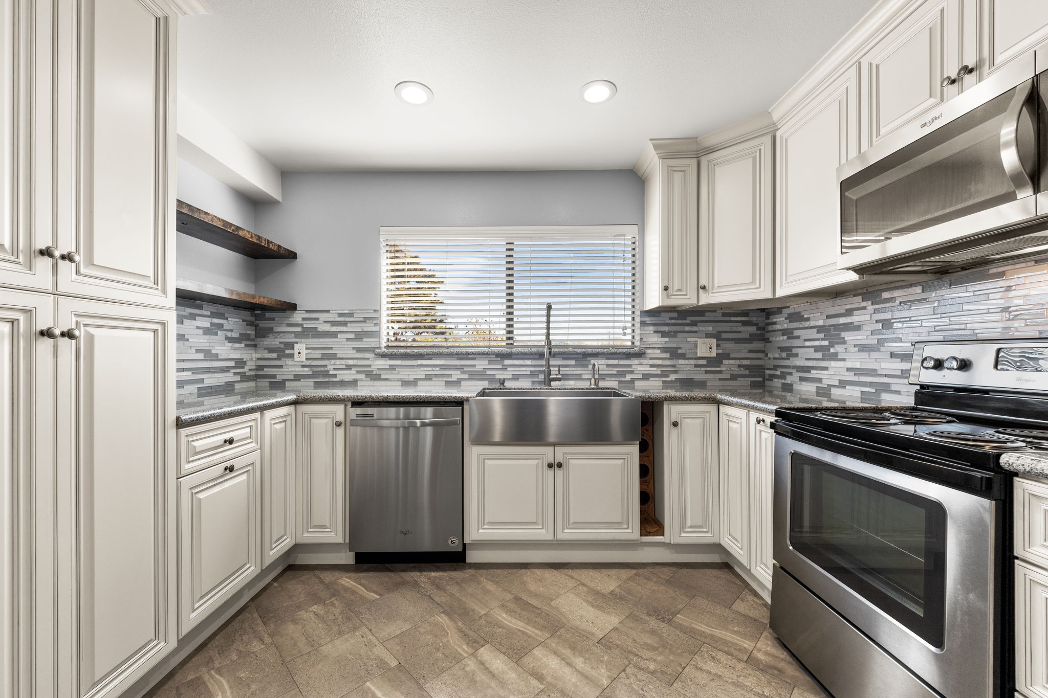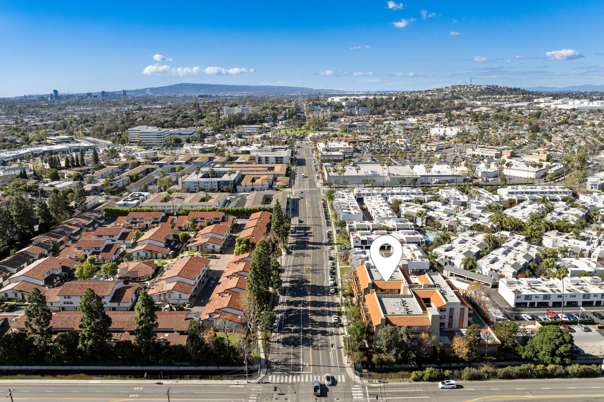 Engineered hardwood flooring creates a refined ambiance, while the kitchen features granite countertops, designer backsplash, and stainless steel appliances. The spacious primary suite offers an en-suite bath with dual sinks, while the second bedroom includes its own private en-suite bath with a generous shower and extended counter space. Enjoy indoor-outdoor living on the long private balcony with neighborhood views, plus the convenience of in-unit laundry. Community amenities include pool, spa, and controlled access. Two side-by-side garage parking spaces included.