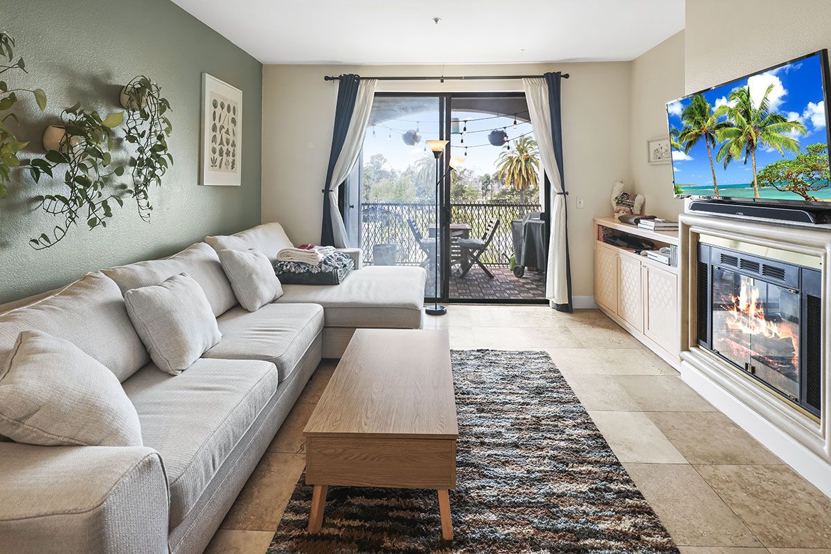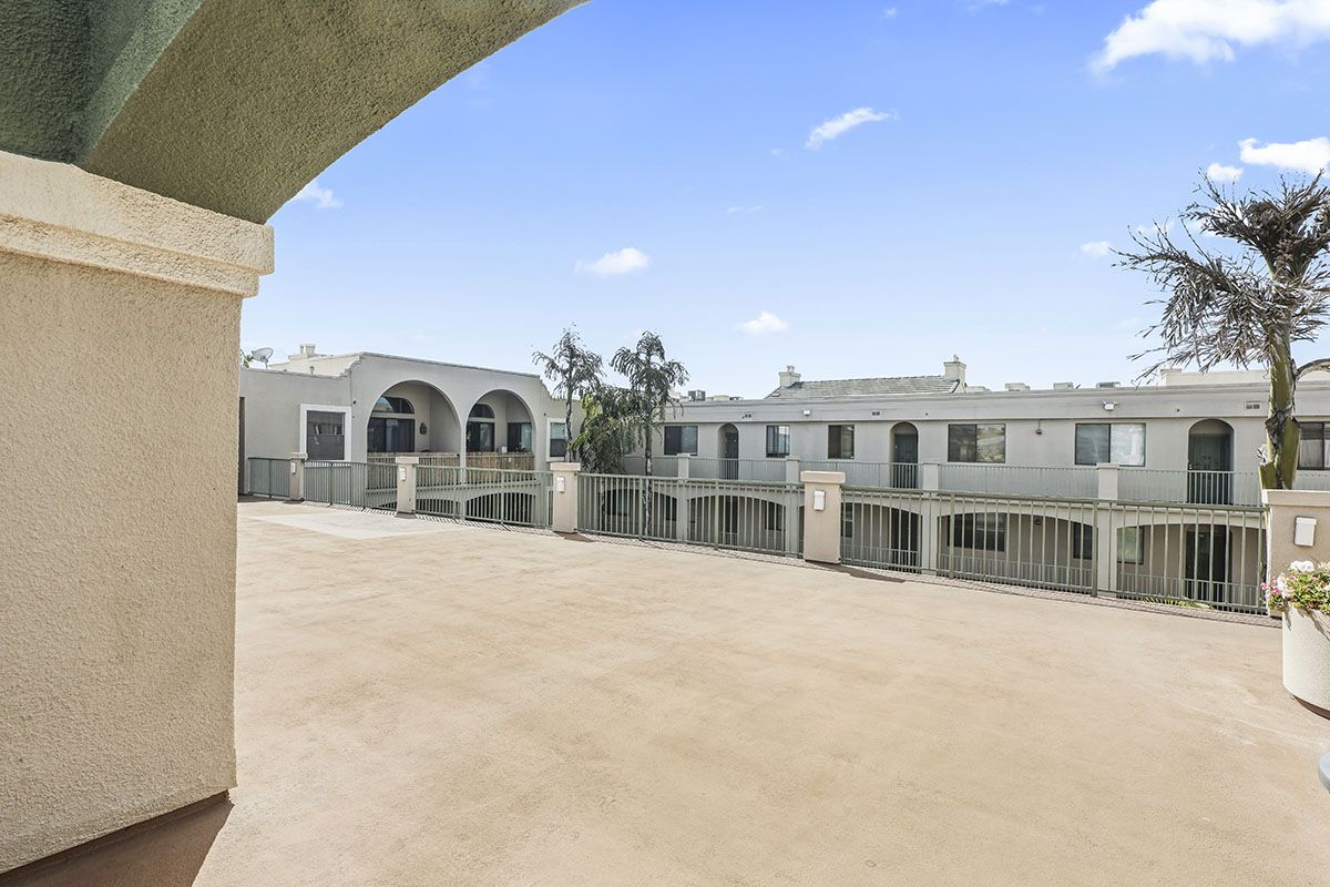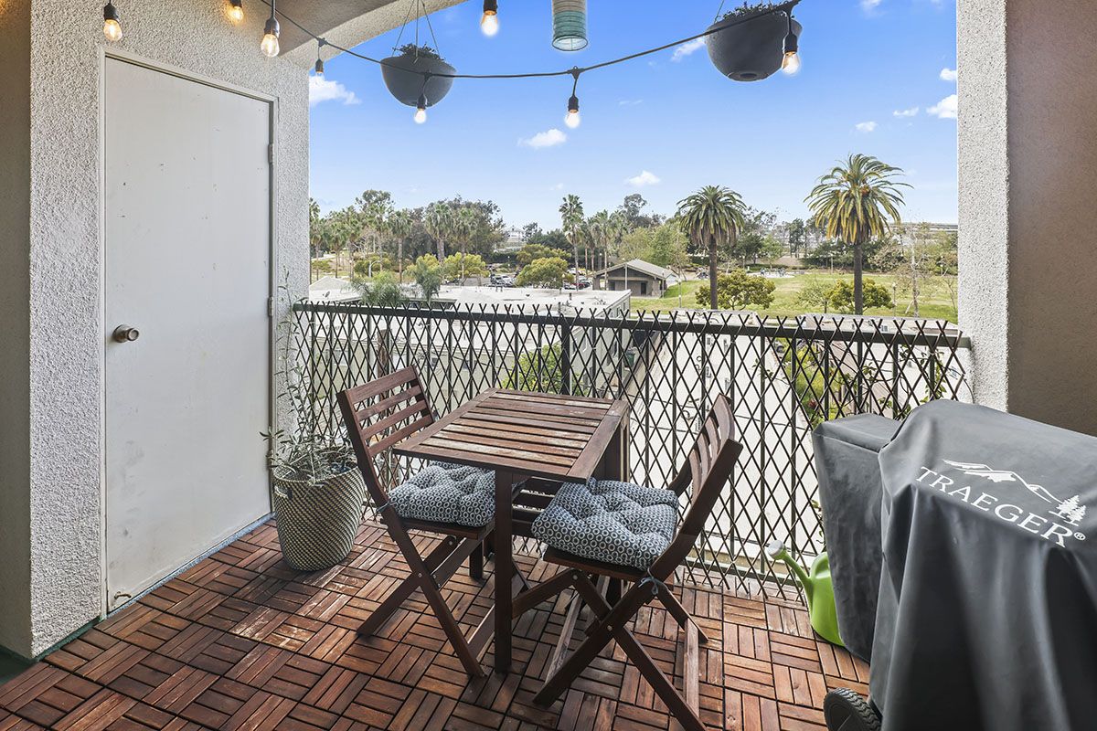 The living/dining room area flows together, leading from the front door to sliding glass doors that open to the large balcony. A gas fireplace in the living room adds a modern element to the chic condo. The kitchen overlooks the main area and features ample storage space, as well as a laundry closet that holds stackable appliances. The kitchen offers granite counters a newer installed water filtration system. The bedroom is roomy and comfortable, with neutral carpet, mirrored closet doors, and direct access to the patio through sliding glass doors. Natural light brightens much of the condo, enhancing the spacious atmosphere. The patio offers some privacy while offering a sweeping view of the surrounding scene. Other complex amenities include a community pool and spa, gym, as well as an open rooftop patio area. Tandem parking spaces are located in the gated subterranean parking garage.