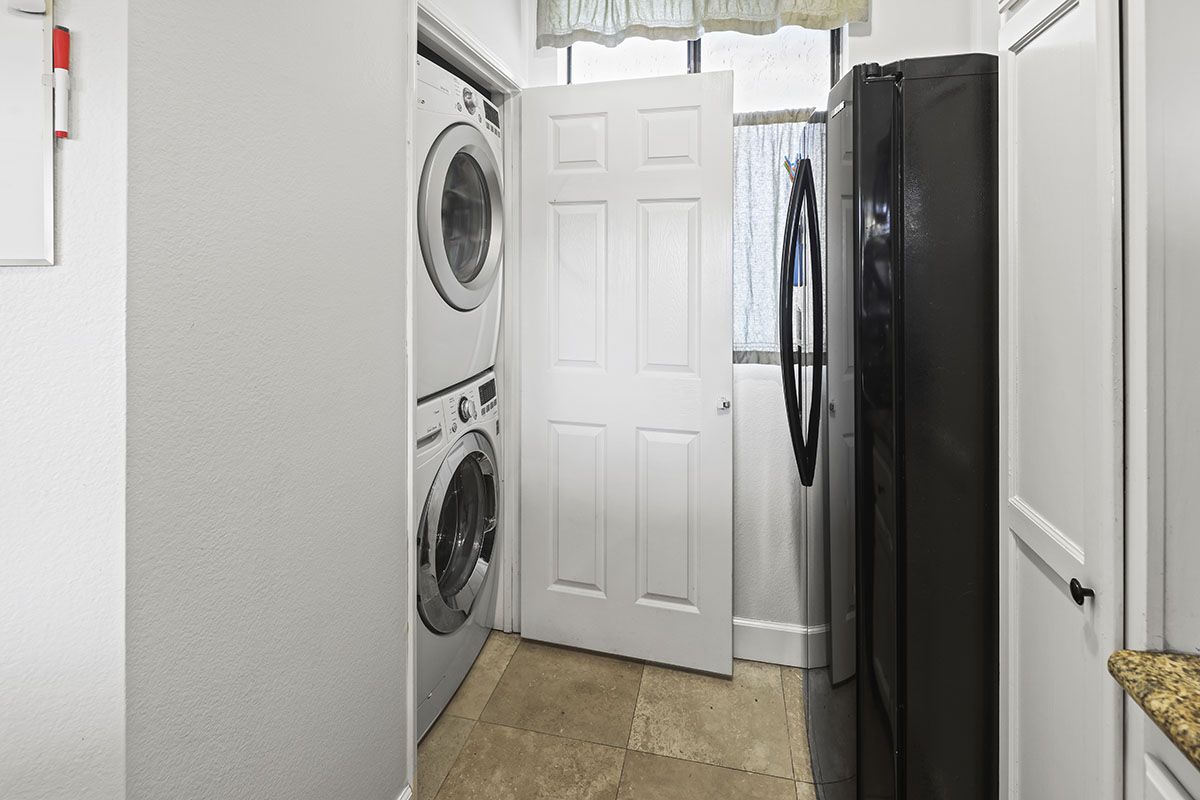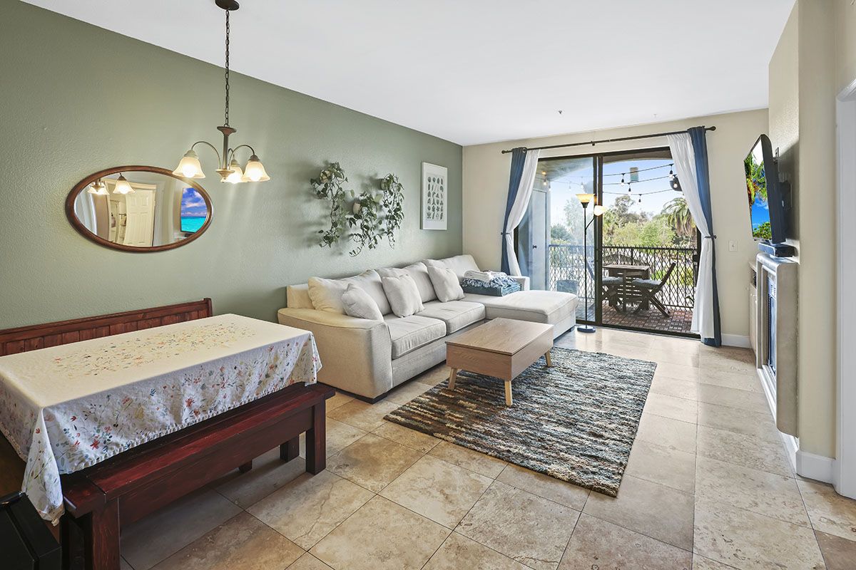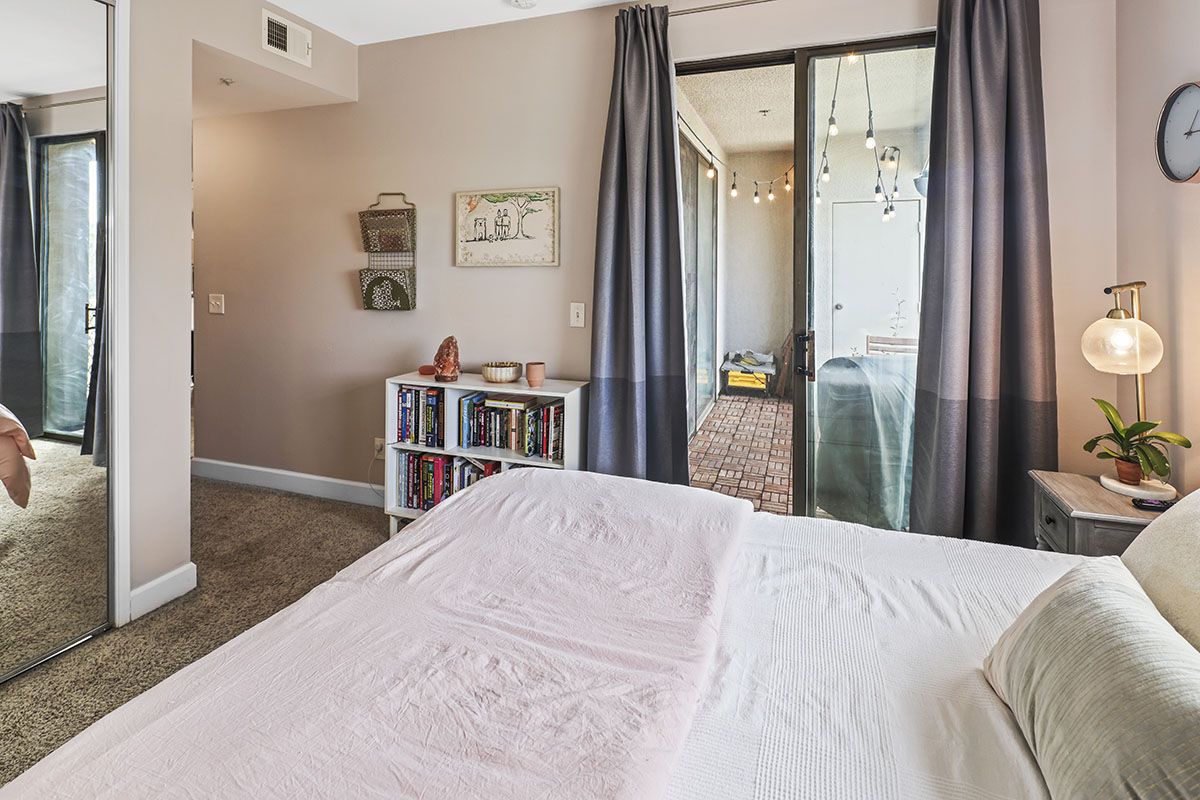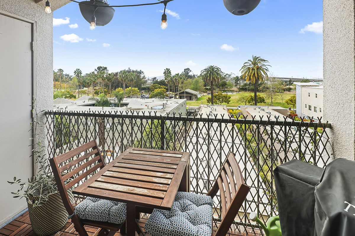 The living/dining room area flows together, leading from the front door to sliding glass doors that open to the large balcony. A gas fireplace in the living room adds a modern element to the chic condo. The kitchen overlooks the main area and features ample storage space, as well as a laundry closet that holds stackable appliances. The kitchen offers granite counters a newer installed water filtration system. The bedroom is roomy and comfortable, with neutral carpet, mirrored closet doors, and direct access to the patio through sliding glass doors. Natural light brightens much of the condo, enhancing the spacious atmosphere. The patio offers some privacy while offering a sweeping view of the surrounding scene. Other complex amenities include a community pool and spa, gym, as well as an open rooftop patio area. Tandem parking spaces are located in the gated subterranean parking garage.