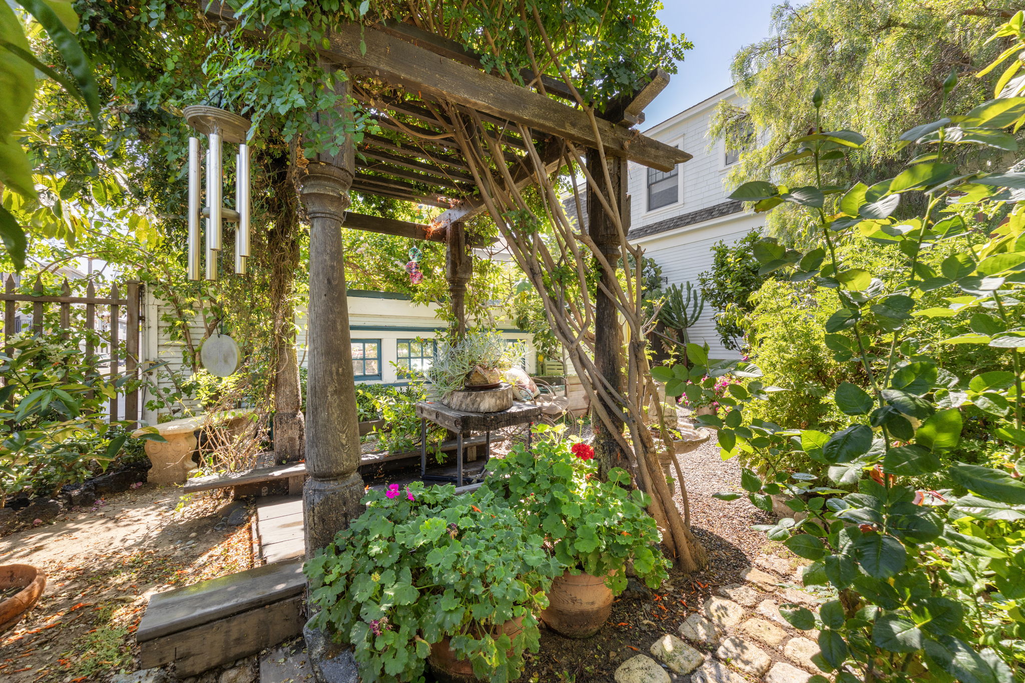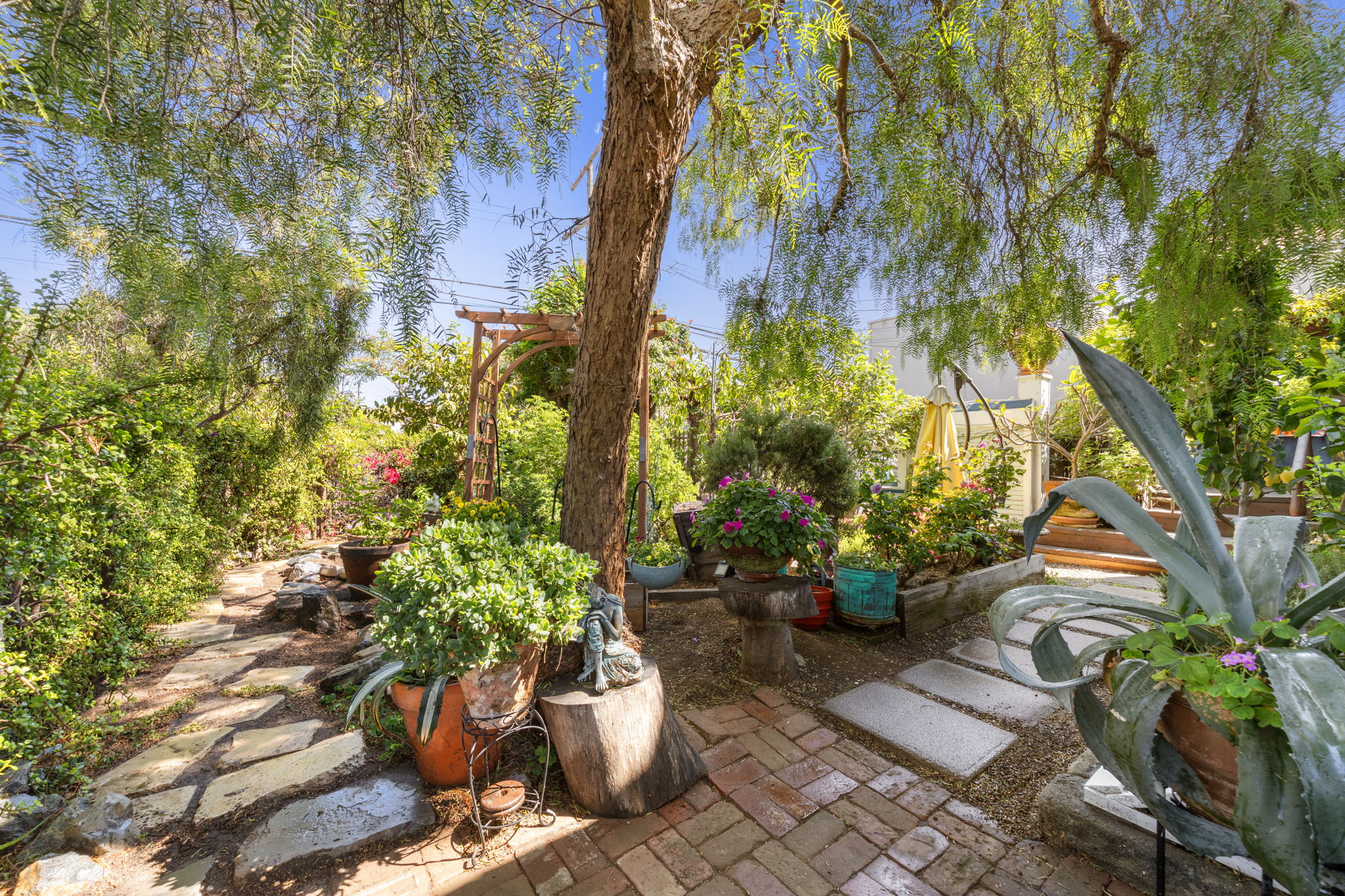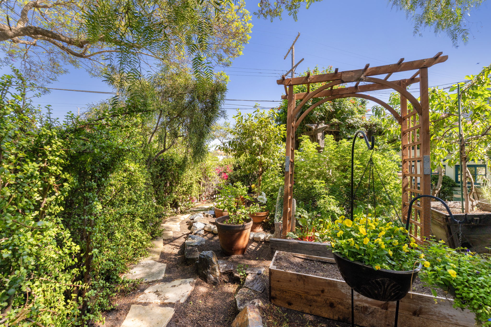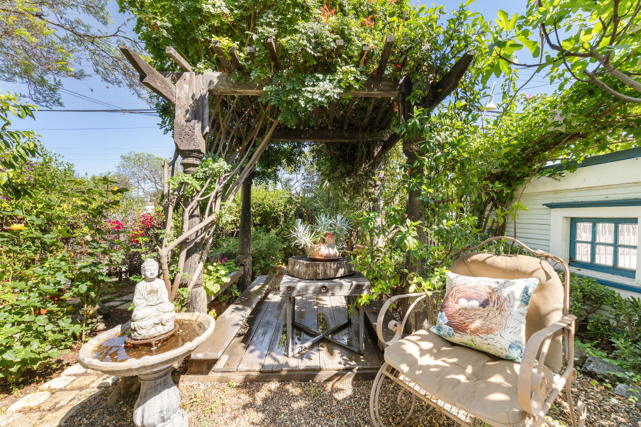 Inside you will find rich hardwood floors, elegant crown moldings, and a warm, inviting layout designed for both everyday living and entertaining. The main level features a formal living room and a refined dining room separated by a charming pocket door—preserving the home’s original character while offering flexible flow. The updated kitchen is both stylish and functional, complete with dark lower cabinetry, crisp white countertops, stainless steel appliances, a large farmhouse sink, and bright white upper cabinets. A dedicated laundry room provides stacked units and abundant storage. The downstairs den showcases dramatic dark wood beam ceilings, a full wet bar, and French doors that open to the backyard, creating the perfect indoor-outdoor entertaining space. The downstairs bedroom offers comfort and privacy with its own en suite bathroom featuring a classic clawfoot tub, pedestal sink, subway tile, and large sun-filled windows. The Upper level includes three additional bedrooms, including one with access to a private balcony—ideal for a spacious office or creative retreat. The guest bathroom echoes the home’s vintage charm with another clawfoot tub and a separate walk-in shower. Outside, the lushly landscaped backyard is a true sanctuary, filled with vibrant flowers, mature plants, and multiple areas to relax and unwind. A charming wooden archway frames a cozy seating area, while the large back porch easily accommodates a full outdoor dining setup—perfect for entertaining under the Southern California sun. Additional highlights include a driveway with two parking spaces and a location just moments from Drake park, The Benbridge house, dining, and all that Long Beach has to offer.