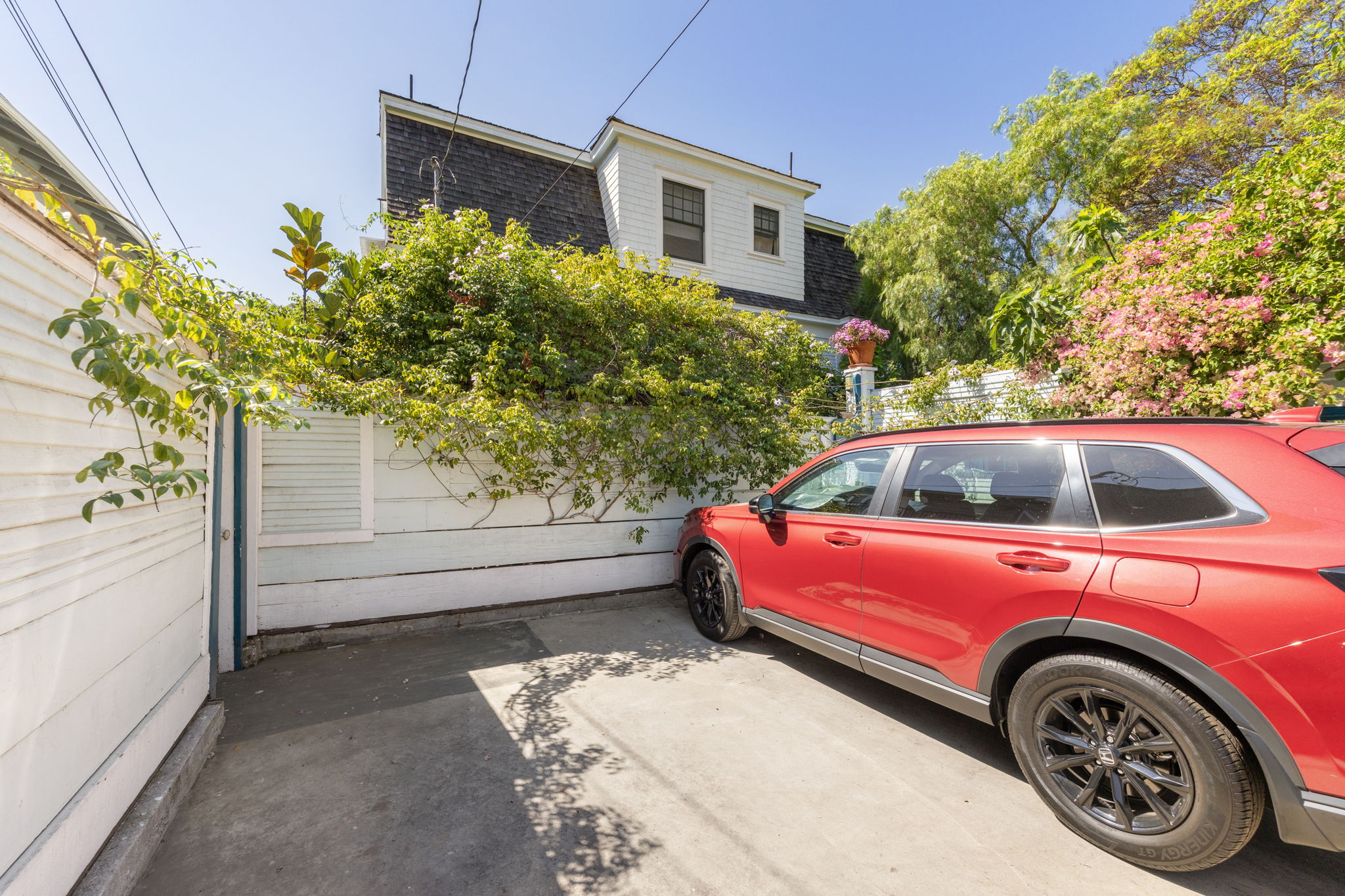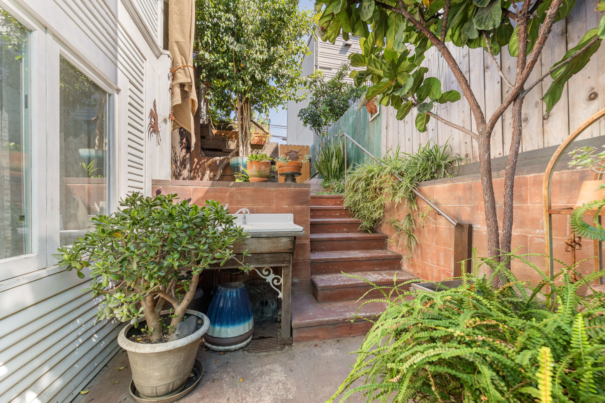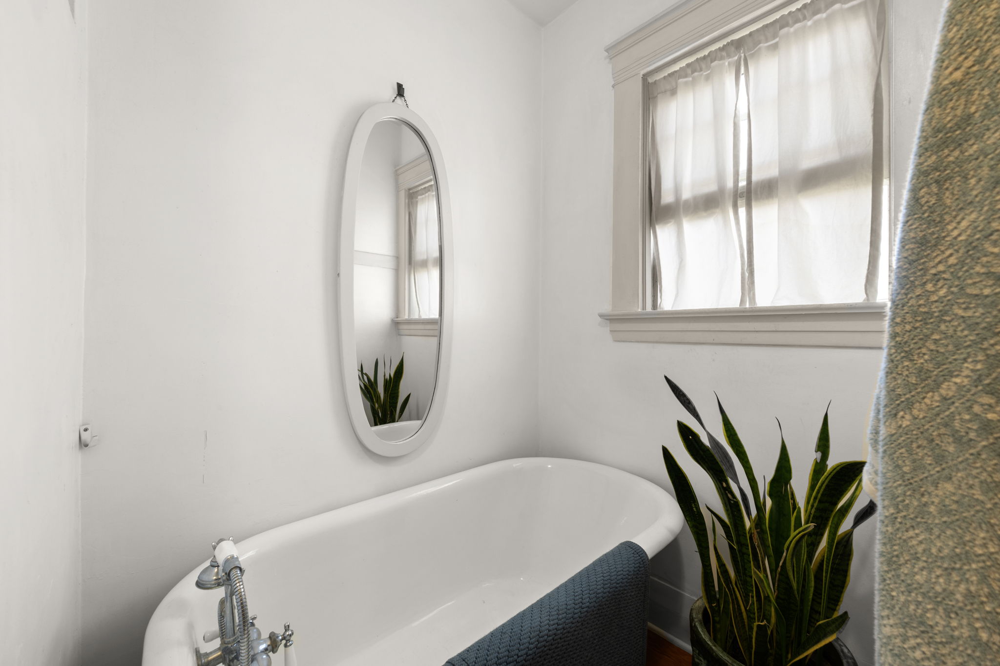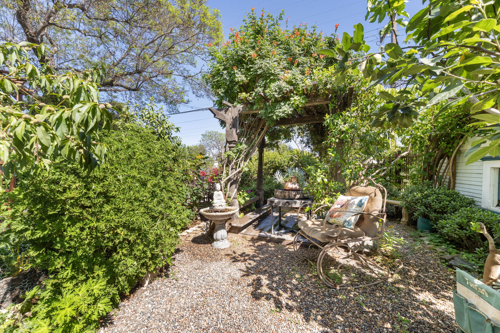 Inside you will find rich hardwood floors, elegant crown moldings, and a warm, inviting layout designed for both everyday living and entertaining. The main level features a formal living room and a refined dining room separated by a charming pocket door—preserving the home’s original character while offering flexible flow. The updated kitchen is both stylish and functional, complete with dark lower cabinetry, crisp white countertops, stainless steel appliances, a large farmhouse sink, and bright white upper cabinets. A dedicated laundry room provides stacked units and abundant storage. The downstairs den showcases dramatic dark wood beam ceilings, a full wet bar, and French doors that open to the backyard, creating the perfect indoor-outdoor entertaining space. The downstairs bedroom offers comfort and privacy with its own en suite bathroom featuring a classic clawfoot tub, pedestal sink, subway tile, and large sun-filled windows. The Upper level includes three additional bedrooms, including one with access to a private balcony—ideal for a spacious office or creative retreat. The guest bathroom echoes the home’s vintage charm with another clawfoot tub and a separate walk-in shower. Outside, the lushly landscaped backyard is a true sanctuary, filled with vibrant flowers, mature plants, and multiple areas to relax and unwind. A charming wooden archway frames a cozy seating area, while the large back porch easily accommodates a full outdoor dining setup—perfect for entertaining under the Southern California sun. Additional highlights include a driveway with two parking spaces and a location just moments from Drake park, The Benbridge house, dining, and all that Long Beach has to offer.