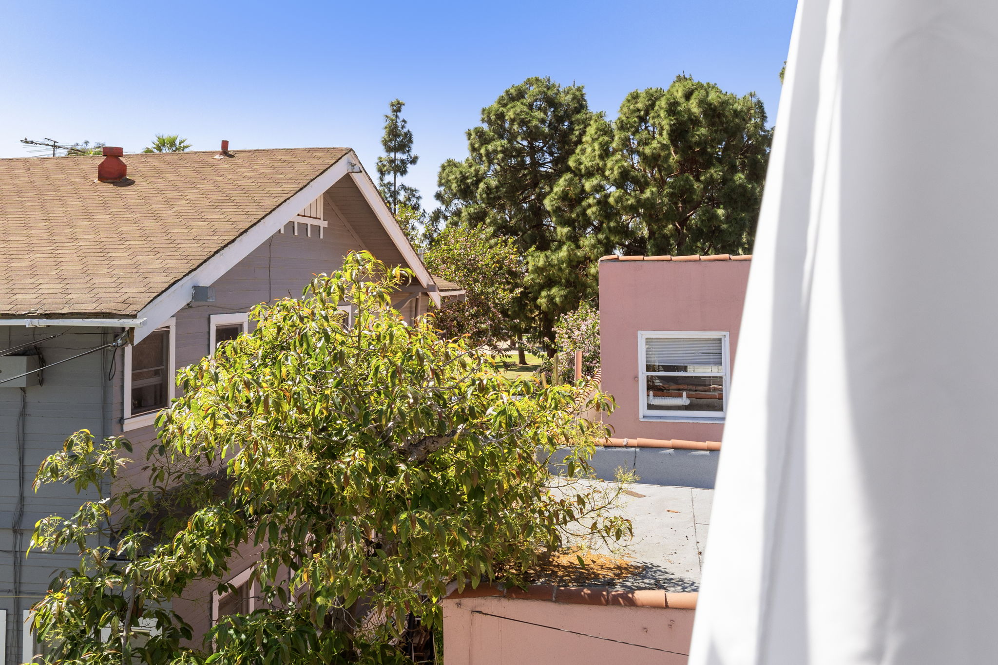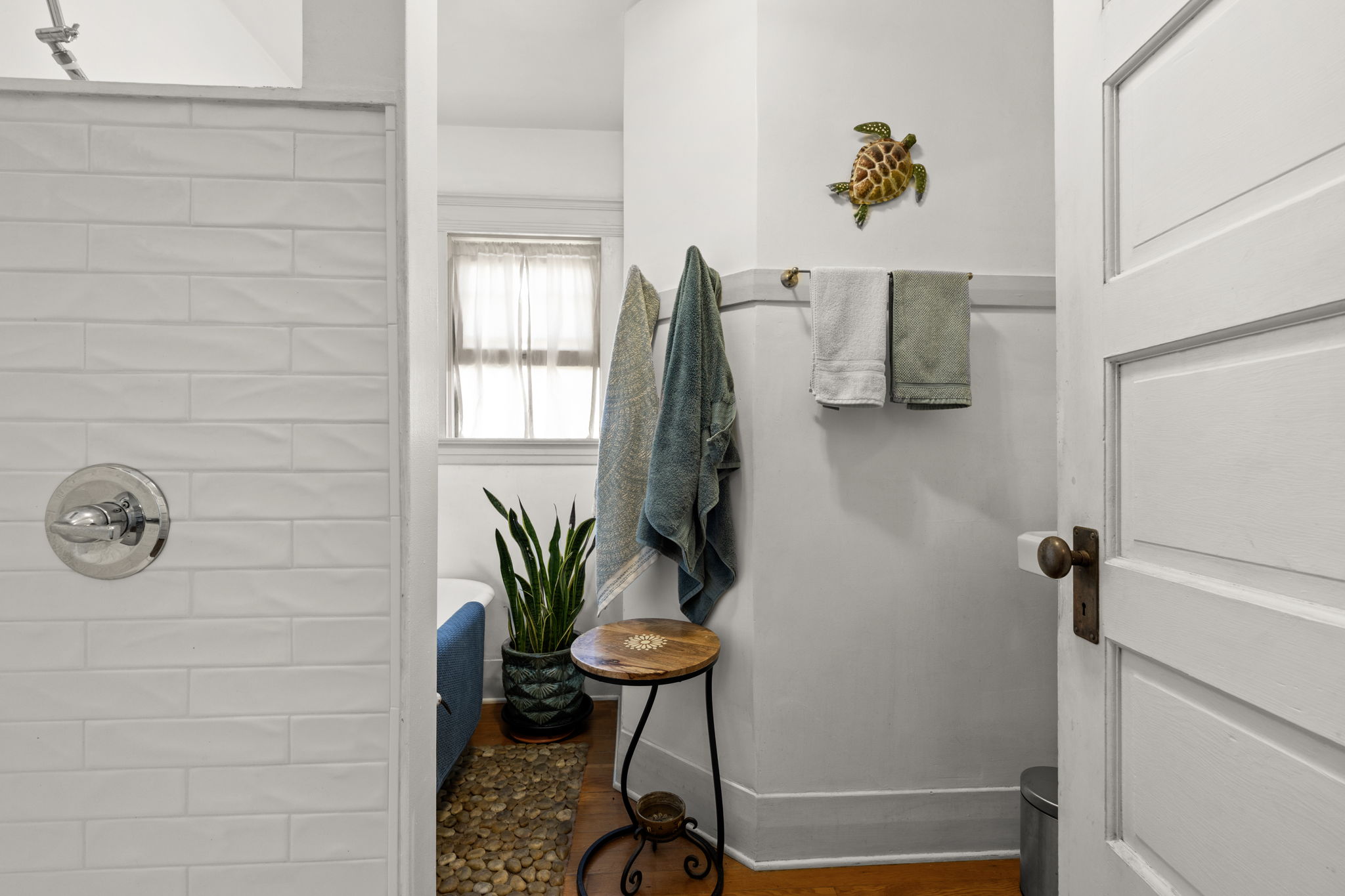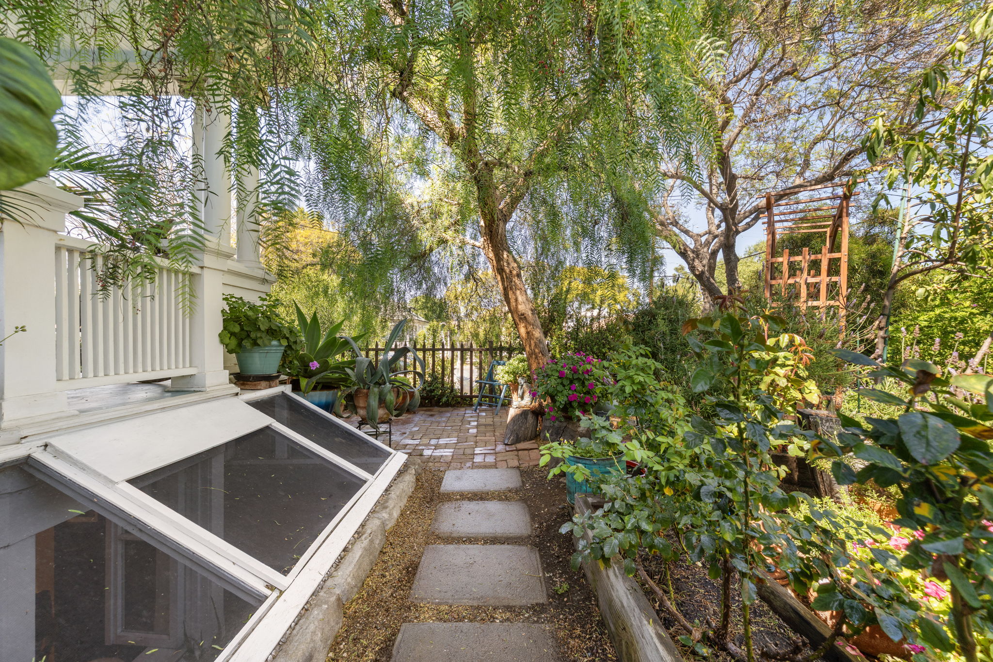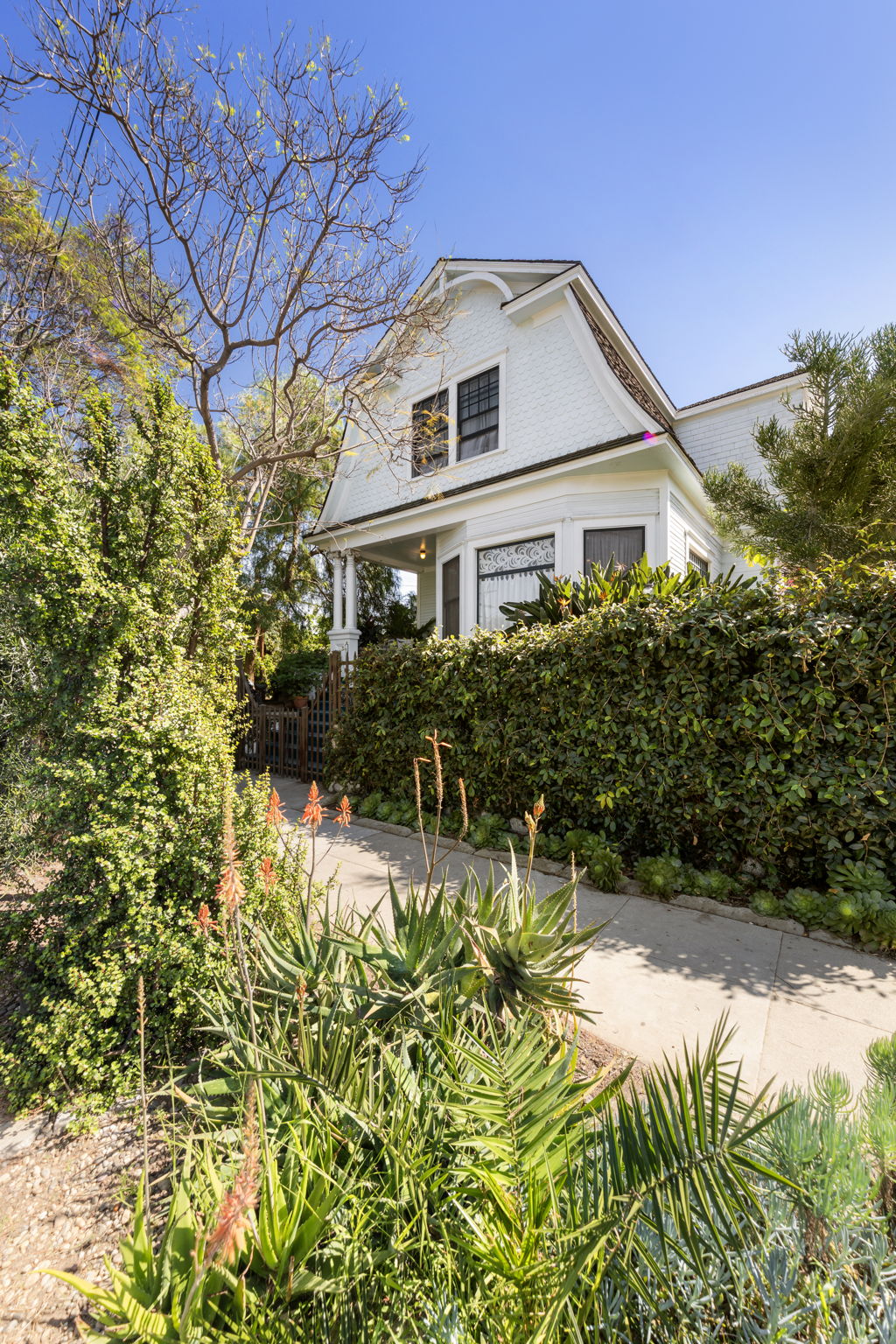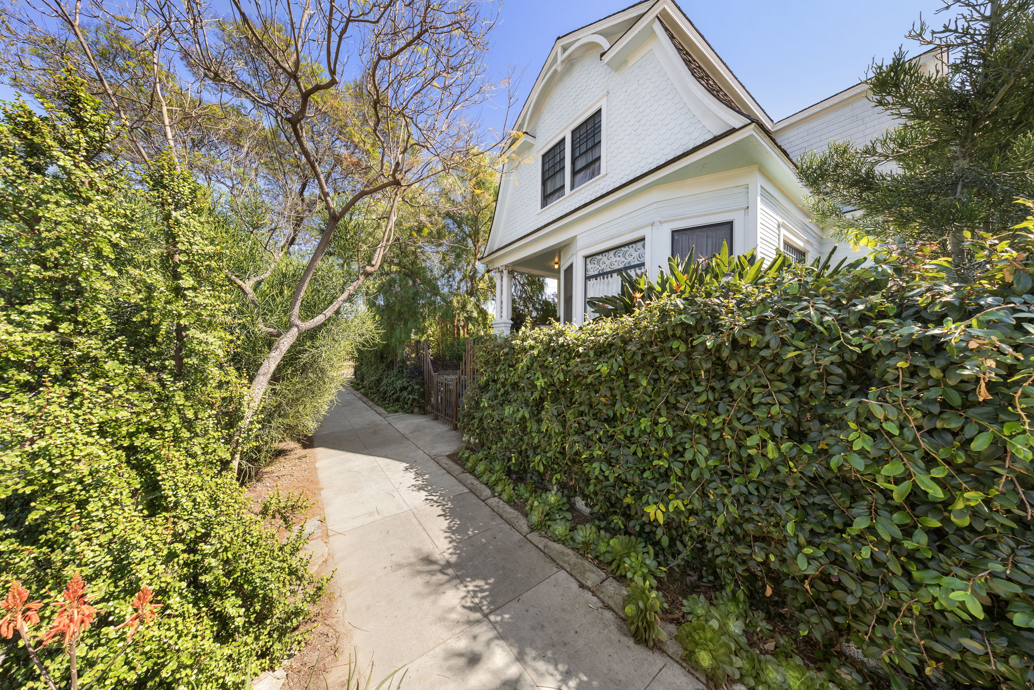 Inside you will find rich hardwood floors, elegant crown moldings, and a warm, inviting layout designed for both everyday living and entertaining. The main level features a formal living room and a refined dining room separated by a charming pocket door—preserving the home’s original character while offering flexible flow. The updated kitchen is both stylish and functional, complete with dark lower cabinetry, crisp white countertops, stainless steel appliances, a large farmhouse sink, and bright white upper cabinets. A dedicated laundry room provides stacked units and abundant storage. The downstairs den showcases dramatic dark wood beam ceilings, a full wet bar, and French doors that open to the backyard, creating the perfect indoor-outdoor entertaining space. The downstairs bedroom offers comfort and privacy with its own en suite bathroom featuring a classic clawfoot tub, pedestal sink, subway tile, and large sun-filled windows. The Upper level includes three additional bedrooms, including one with access to a private balcony—ideal for a spacious office or creative retreat. The guest bathroom echoes the home’s vintage charm with another clawfoot tub and a separate walk-in shower. Outside, the lushly landscaped backyard is a true sanctuary, filled with vibrant flowers, mature plants, and multiple areas to relax and unwind. A charming wooden archway frames a cozy seating area, while the large back porch easily accommodates a full outdoor dining setup—perfect for entertaining under the Southern California sun. Additional highlights include a driveway with two parking spaces and a location just moments from Drake park, The Benbridge house, dining, and all that Long Beach has to offer.