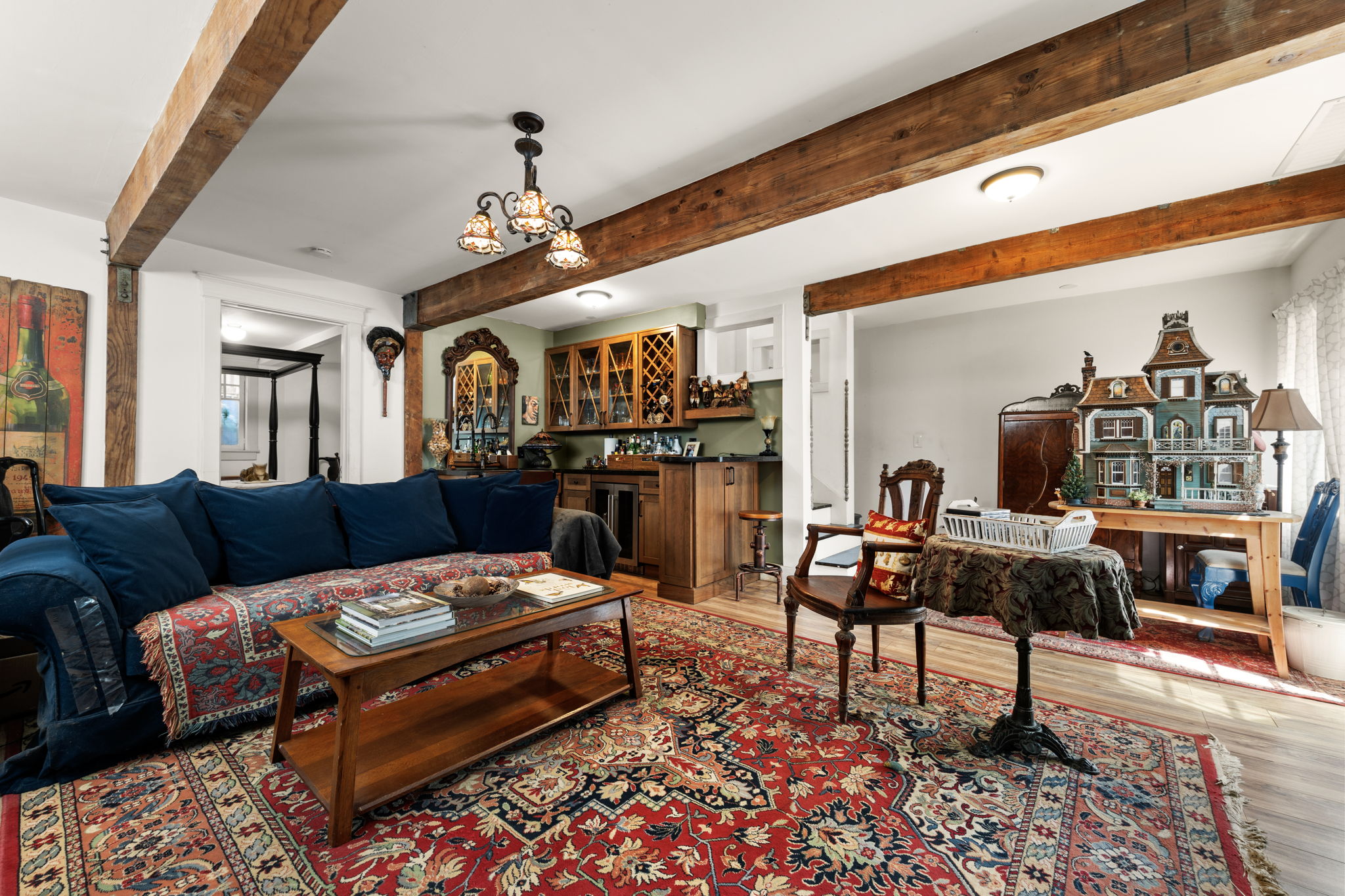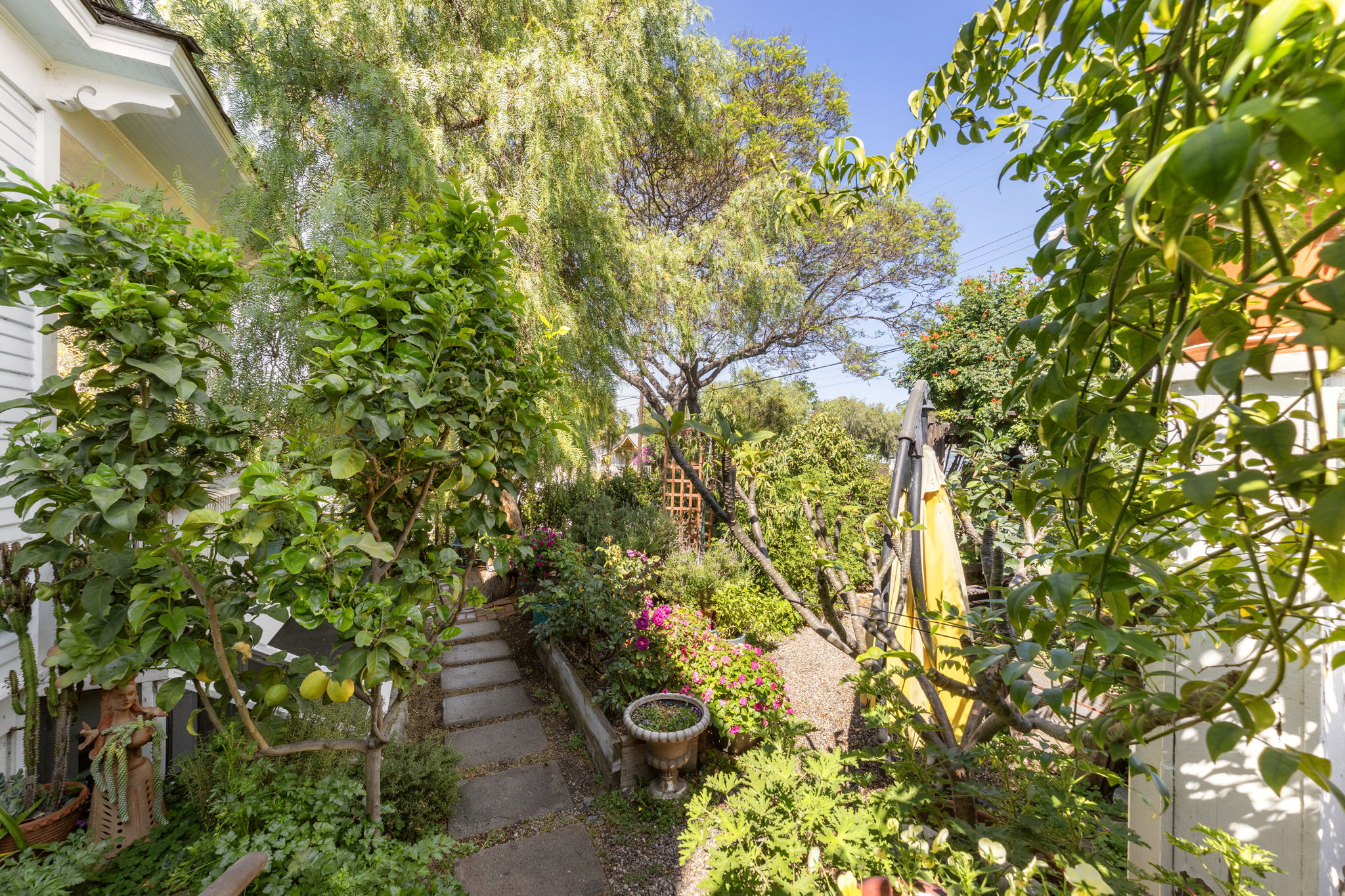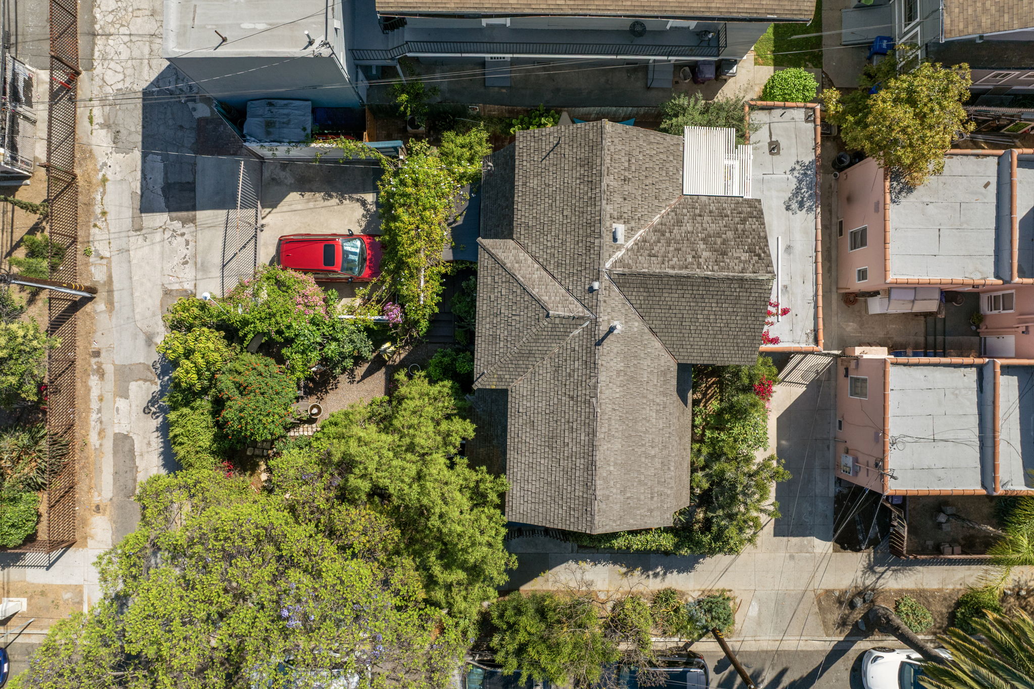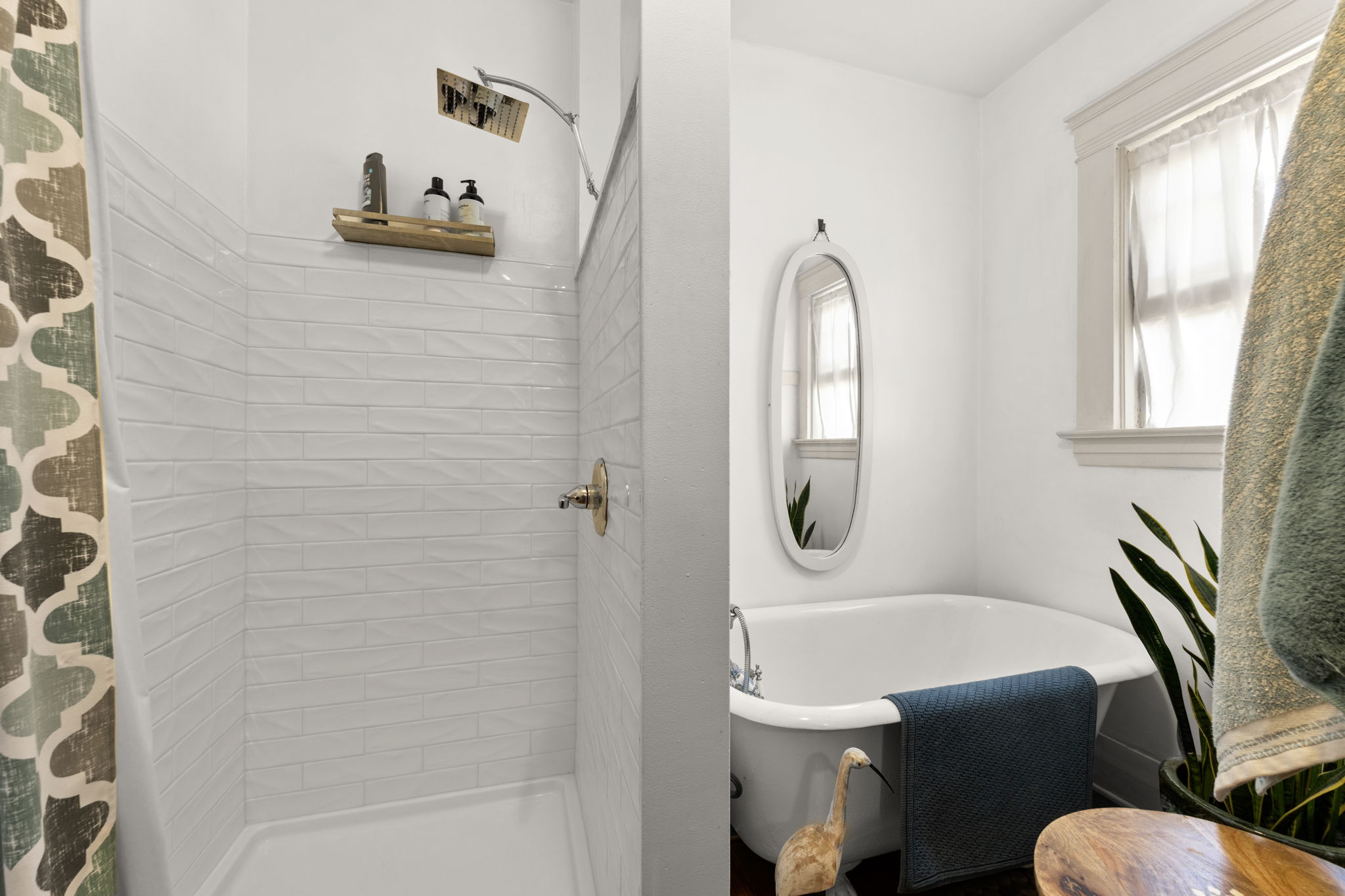 Inside you will find rich hardwood floors, elegant crown moldings, and a warm, inviting layout designed for both everyday living and entertaining. The main level features a formal living room and a refined dining room separated by a charming pocket door—preserving the home’s original character while offering flexible flow. The updated kitchen is both stylish and functional, complete with dark lower cabinetry, crisp white countertops, stainless steel appliances, a large farmhouse sink, and bright white upper cabinets. A dedicated laundry room provides stacked units and abundant storage. The downstairs den showcases dramatic dark wood beam ceilings, a full wet bar, and French doors that open to the backyard, creating the perfect indoor-outdoor entertaining space. The downstairs bedroom offers comfort and privacy with its own en suite bathroom featuring a classic clawfoot tub, pedestal sink, subway tile, and large sun-filled windows. The Upper level includes three additional bedrooms, including one with access to a private balcony—ideal for a spacious office or creative retreat. The guest bathroom echoes the home’s vintage charm with another clawfoot tub and a separate walk-in shower. Outside, the lushly landscaped backyard is a true sanctuary, filled with vibrant flowers, mature plants, and multiple areas to relax and unwind. A charming wooden archway frames a cozy seating area, while the large back porch easily accommodates a full outdoor dining setup—perfect for entertaining under the Southern California sun. Additional highlights include a driveway with two parking spaces and a location just moments from Drake park, The Benbridge house, dining, and all that Long Beach has to offer.
