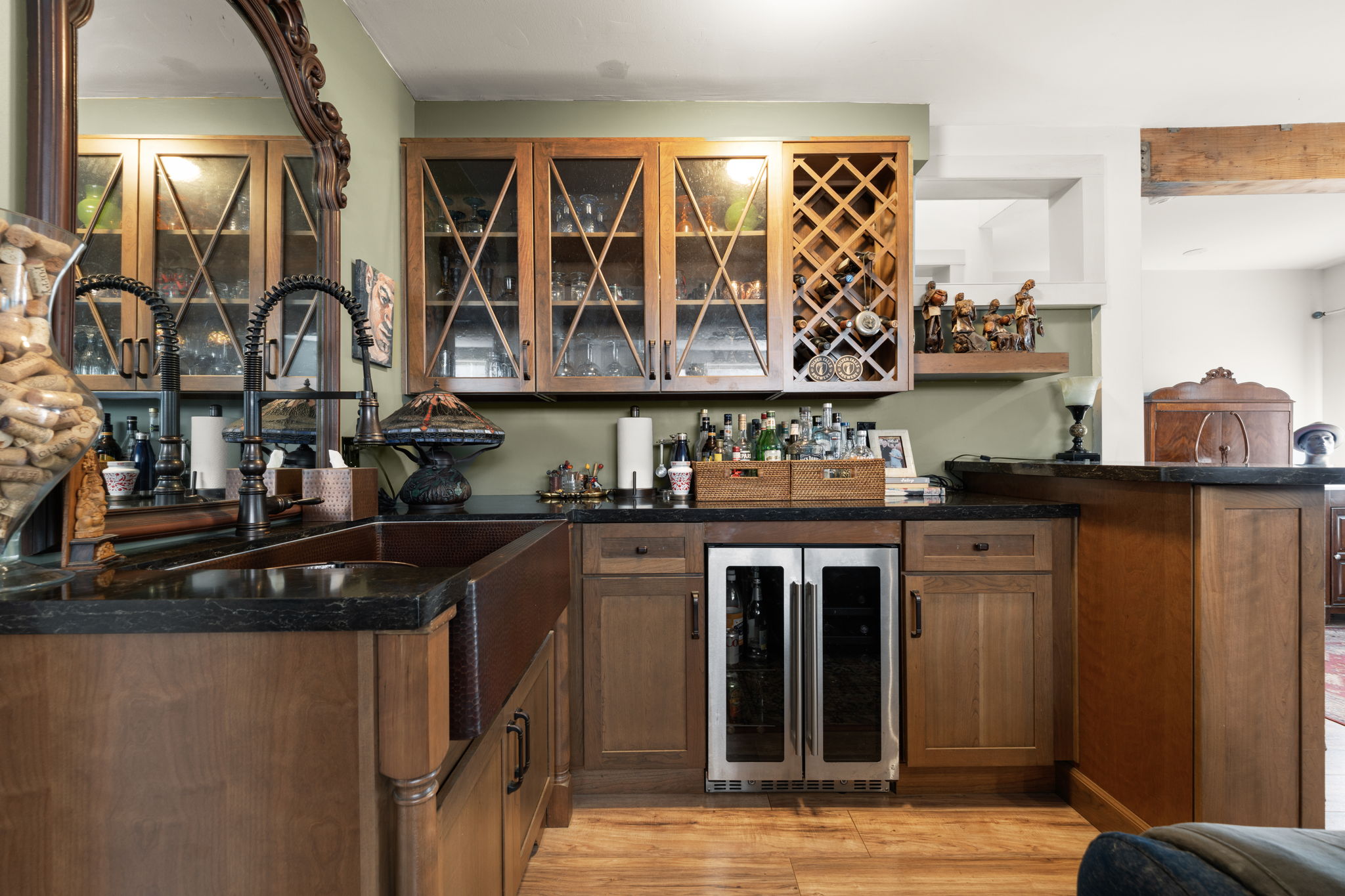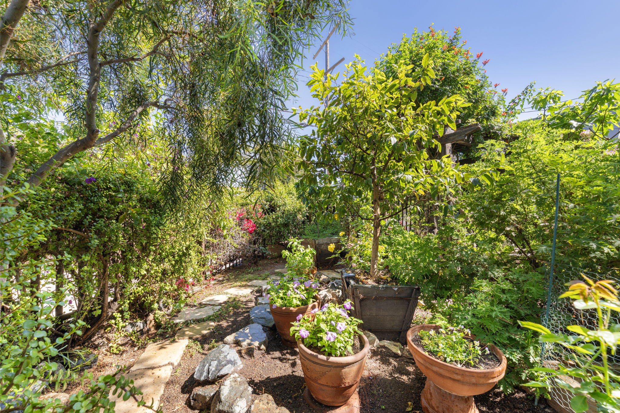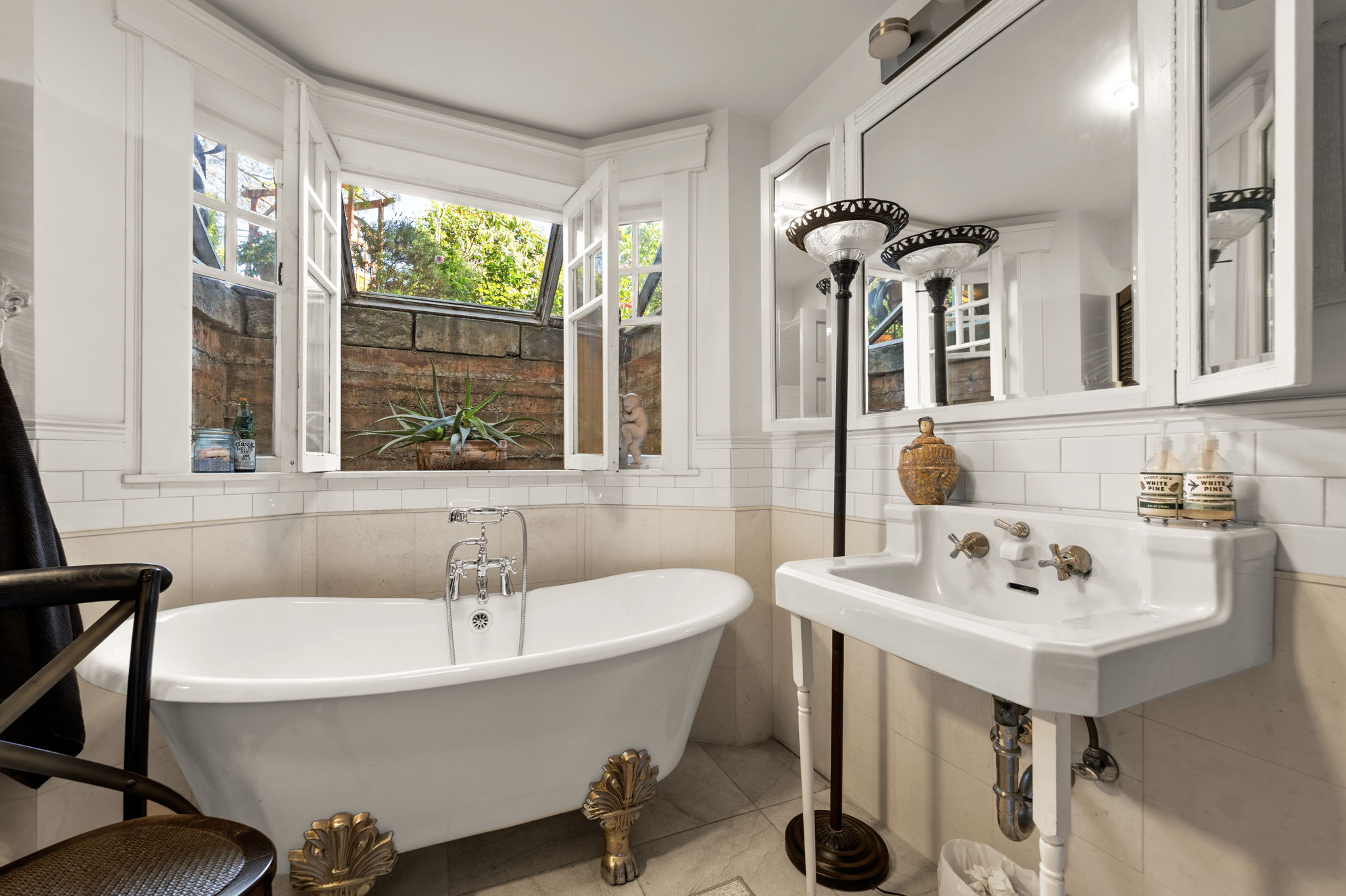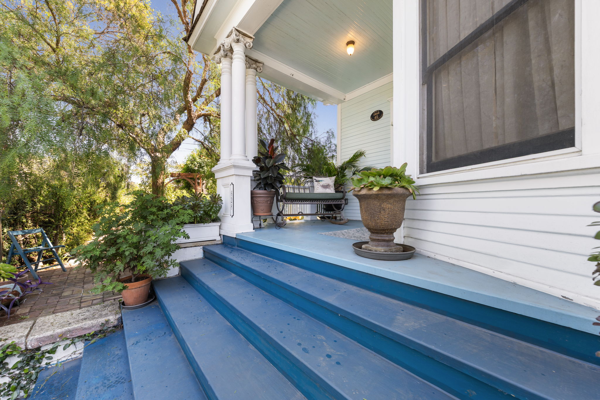 Inside you will find rich hardwood floors, elegant crown moldings, and a warm, inviting layout designed for both everyday living and entertaining. The main level features a formal living room and a refined dining room separated by a charming pocket door—preserving the home’s original character while offering flexible flow. The updated kitchen is both stylish and functional, complete with dark lower cabinetry, crisp white countertops, stainless steel appliances, a large farmhouse sink, and bright white upper cabinets. A dedicated laundry room provides stacked units and abundant storage. The downstairs den showcases dramatic dark wood beam ceilings, a full wet bar, and French doors that open to the backyard, creating the perfect indoor-outdoor entertaining space. The downstairs bedroom offers comfort and privacy with its own en suite bathroom featuring a classic clawfoot tub, pedestal sink, subway tile, and large sun-filled windows. The Upper level includes three additional bedrooms, including one with access to a private balcony—ideal for a spacious office or creative retreat. The guest bathroom echoes the home’s vintage charm with another clawfoot tub and a separate walk-in shower. Outside, the lushly landscaped backyard is a true sanctuary, filled with vibrant flowers, mature plants, and multiple areas to relax and unwind. A charming wooden archway frames a cozy seating area, while the large back porch easily accommodates a full outdoor dining setup—perfect for entertaining under the Southern California sun. Additional highlights include a driveway with two parking spaces and a location just moments from Drake park, The Benbridge house, dining, and all that Long Beach has to offer.